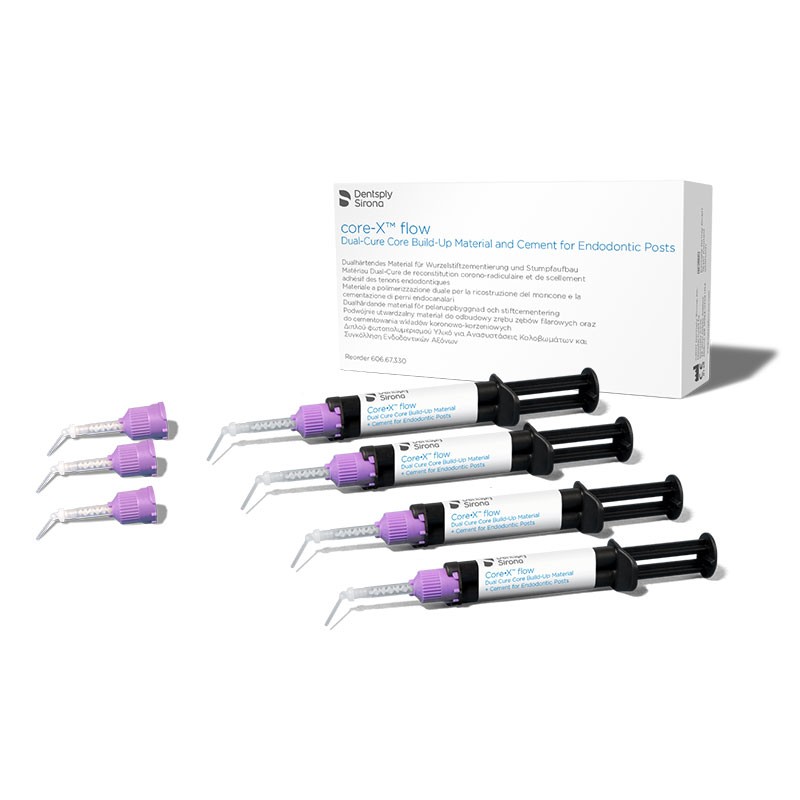 Core x flow es una pasta de dos componentes, base y catalizador que cuando se mezclan forman un composite de resina de curado dual para cementación y reconstrucción de muñones. Corex flow usa una resina biocompatible de uretano y su color es similar al color del diente, lo que es ideal para restauraciones en las que la estética es prioritaria.