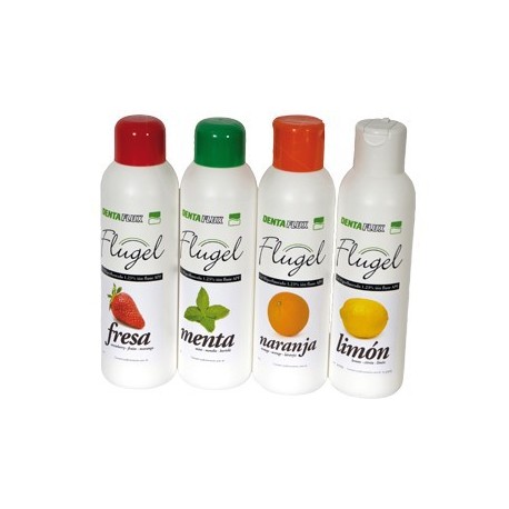 Gel de Flúor Flugel hiperfluorado (1,23%F) para aplicaciones tópicas de solo 1 minuto en cubetas. Es tixotrópico y de sabor agradable. Se presenta en botellas de 1 litro (económico) con sabores a Chicle-Fresa, Menta ó Naranja. Registrado en el Ministerio de Sanidad.